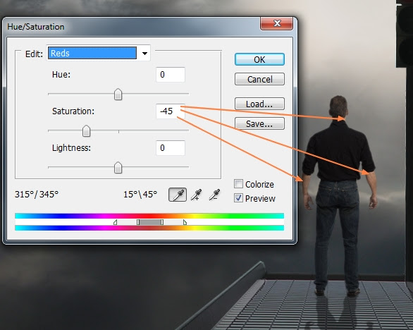 I use a Hue/Saturation layer with Clipping Mask to reduce saturation of man’s skin: